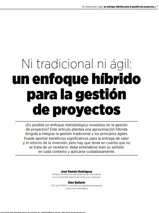 Título: Ni tradicional ni ágil: un enfoque híbrido para la gestión de proyectos Autores: José Ramón Rodríguez y Àlex Ballarín Revista: Harvard Deusto Año: 2026 Páginas: 1-10 Formato : digital Temas: ENFOQUE HÍBRIDOS | PLANIFICACIÓN | METODOLOGÍA ÁGIL |