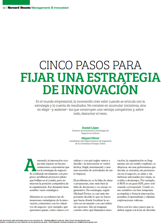 Título: Cinco pasos para fijar una estrategia de innovación Autor: Daniel López y Miquel Oliver Revista : Harvard Deusto Año: 2025 Páginas : 1-3 Formato: digital Temas: GOBERNANZA DE INNOVACIÓN | INTEGRACIÓN DE RESULTADOS | VACÍO ESTRATÉGICO | PRODUCTIVIDAD Disponibilidad:Solicitar documento a biblioteca@servir.gob.pe