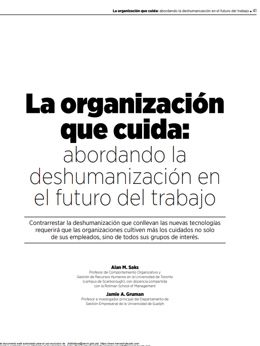 Título: La organización que cuida: abordando la deshumanización en el futuro del trabajo Autor: Alan M. Saks y Jamie A. Gruman Revista: Harvard Deusto Año: 2025 Páginas: 1-8 Formato: digital Temas: BIENESTAR LABORAL | CULTURA DE LOS CUIDADOS | FUTURO DEL TRABAJO | DESHUMANIZACIÓN TECNOLÓGICA Disponibilidad: Solicitar documento a biblioteca@servir.gob.pe