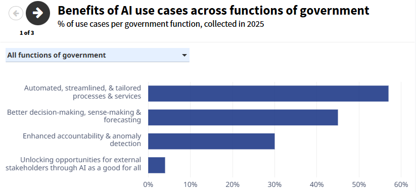 La IA gubernamental se emplea principalmente para automatizar y optimizar servicios (57%) y mejorar la toma de decisiones (45%), mientras que solo un 4% permite su uso por actores externos. Se utiliza más en tareas analíticas que en tareas rutinarias. Todos los casos implican riesgos si no se gestionan, incluidos éticos, operativos, digitales y de aceptación pública.