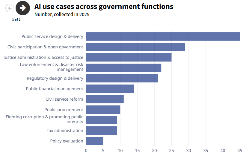 La adopción de la IA en el sector público es reciente y más lenta que en empresas privadas. Se concentra en servicios públicos, justicia y participación cívica, donde hay alta interacción ciudadana. En cambio, su uso en políticas, tributación y gestión pública sigue siendo limitado.
